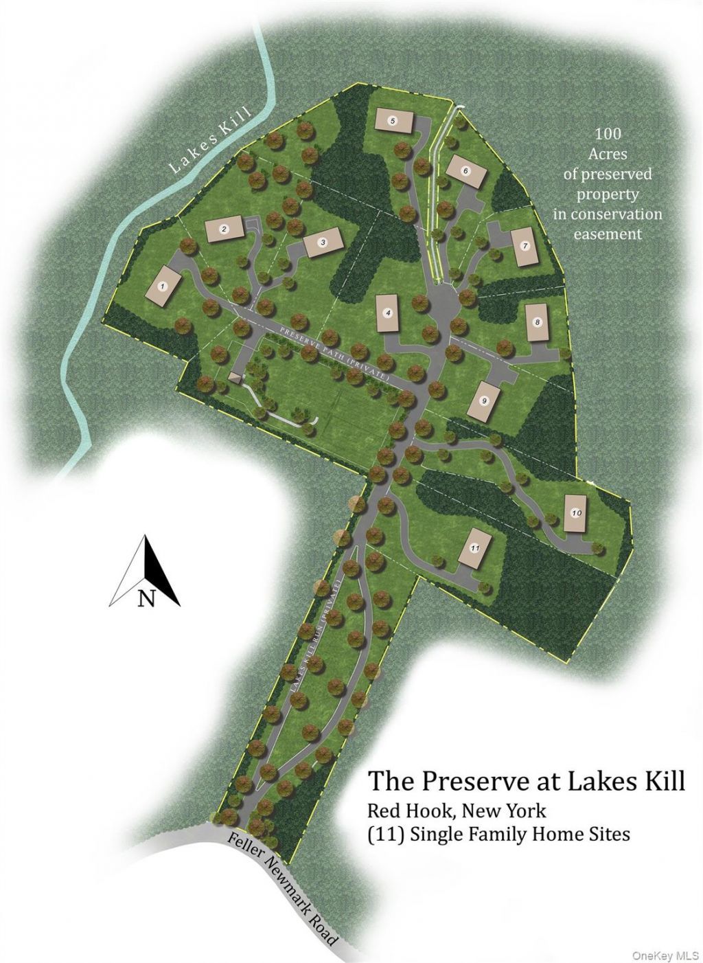 Attention Developers and Builders:Welcome to The Preserve at Lakes Kill - A Rare and Remarkable Hudson Valley OpportunityNestled in the heart of Red Hook, NY, just off the scenic and sought-after Feller Newmark Road, The Preserve at Lakes Kill offers a unique, turn-key residential cluster development spanning 100 pristine acres. This thoughtfully planned enclave consists of 14 land parcels, including 11 approved building lots, each ranging from approximately a half acre to just over an acre, with private access roads and generous setbacks ensuring peace and privacy.What sets The Preserve apart is its extraordinary commitment to conservation and natural beauty. Of the 100-acre parcel, a remarkable 89 acres are protected under a conservation easement held by the respected Winnakee Land Trust. This expansive preserve forms a permanent natural buffer and offers homeowners direct access to tranquil woodlands, winding walking trails, and the serene banks of Lakes Kill, a trout-rich stream that flows into the Saw Kill. Whether you're an avid hiker, birdwatcher, or simply crave the soothing sounds of nature, this sanctuary offers a lifestyle immersed in the outdoors.This project comes with full approvals in place, including a state-of-the-art community septic system, designed to serve the homes collectively and to be managed by the Dutchess County Water and Wastewater Authority after the development is completed. Additional infrastructure is already underway: a private road has been roughed in from Feller Newmark Road through the site, stormwater management systems are in place-including a designated retention area-and underground electric service has been brought to the first lot. The building envelope has been selectively cleared and partially graded, nearly ready for construction to begin.Residents of The Preserve will also be part of a homeowners association that will own and maintain both the conservation land and private roads, ensuring long-term stewardship and shared enjoyment of the community's most valuable assets.Conveniently located in the Red Hook Central School District, The Preserve offers the best of both town and country living. You're just 5 minutes to the charming village of Red Hook, 10 minutes to Rhinebeck, and only 5 minutes to the Taconic State Parkway-providing easy access to parks, golf courses, shopping, fine dining, farmers' markets, and cultural attractions throughout the Hudson Valley.This is more than a development-it's a fully entitled, infrastructure-ready opportunity