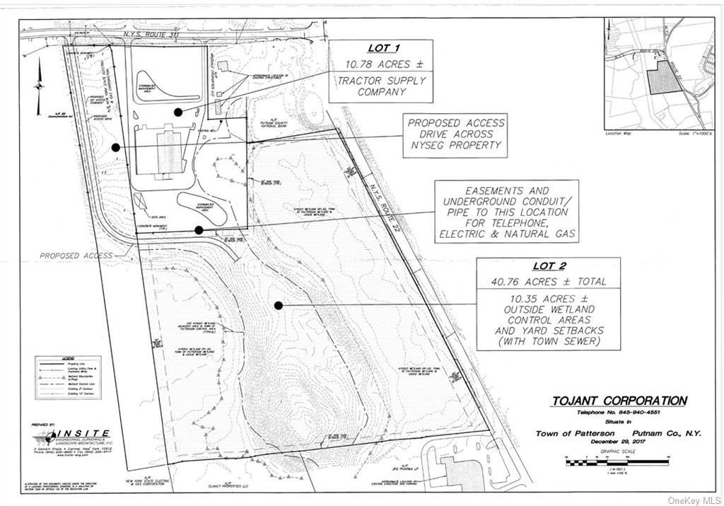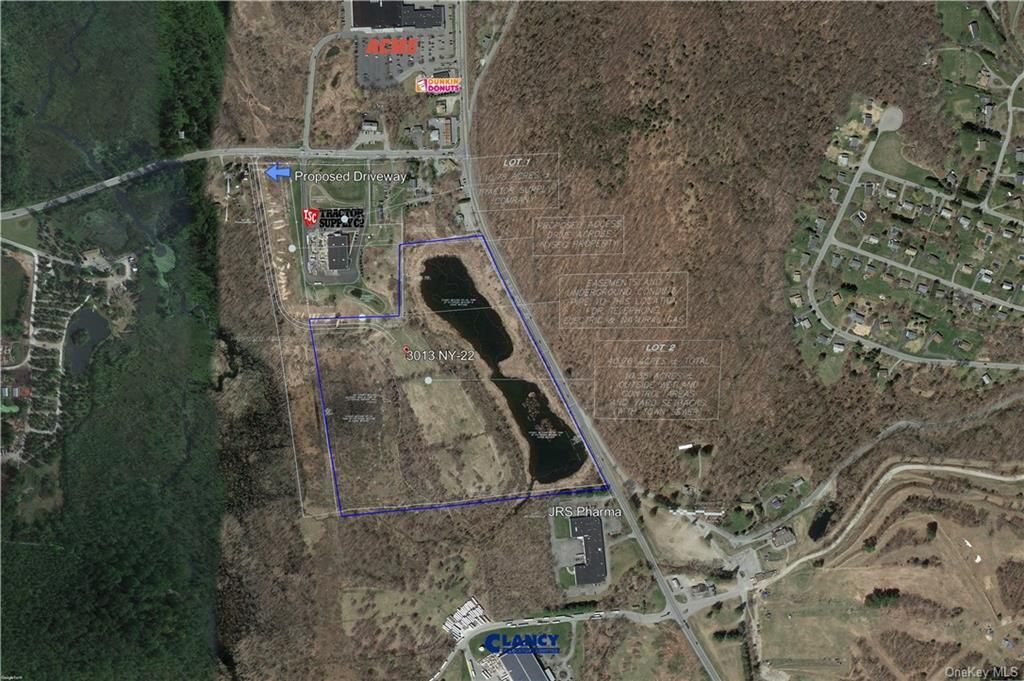 Don't miss this unique commercial opportunity on Route 22. 40.72 commercially zoned acres in one parcel with 10.35 +/- usable acres. The entrance would be from Patterson's main road, Route 311, via a 50-foot-wide driveway. Neighbors are Tractor Supply Co. and Acme Shopping Center on Route 311 and JRS Pharma, Clancy Relocation and Logistics, and the Putnam County National Bank on Route 22. The property is zoned C1, Commercial District, a sample of permitted uses would be self-storage facility, retail stores, research and development, veterinary hospitals, health and fitness centers, indoor and outdoor recreational sports facilities, business and professional offices. An underground conduit is already in place with electric, natural gas and telephone with potential to tie into Patterson's sewage treatment plant. The 10 +/- usable acres are predominantly level and cleared. The acreage sits above the surrounding terrain with views overlooking a lake which fronts Route 22. The site affords high visibility with the significant frontage on Route 22 with an annual average daily traffic count of 15,953. This property can be sold subject to approval, making this an incredible opportunity.